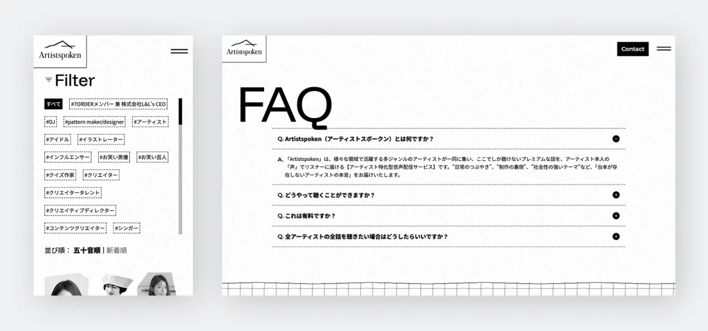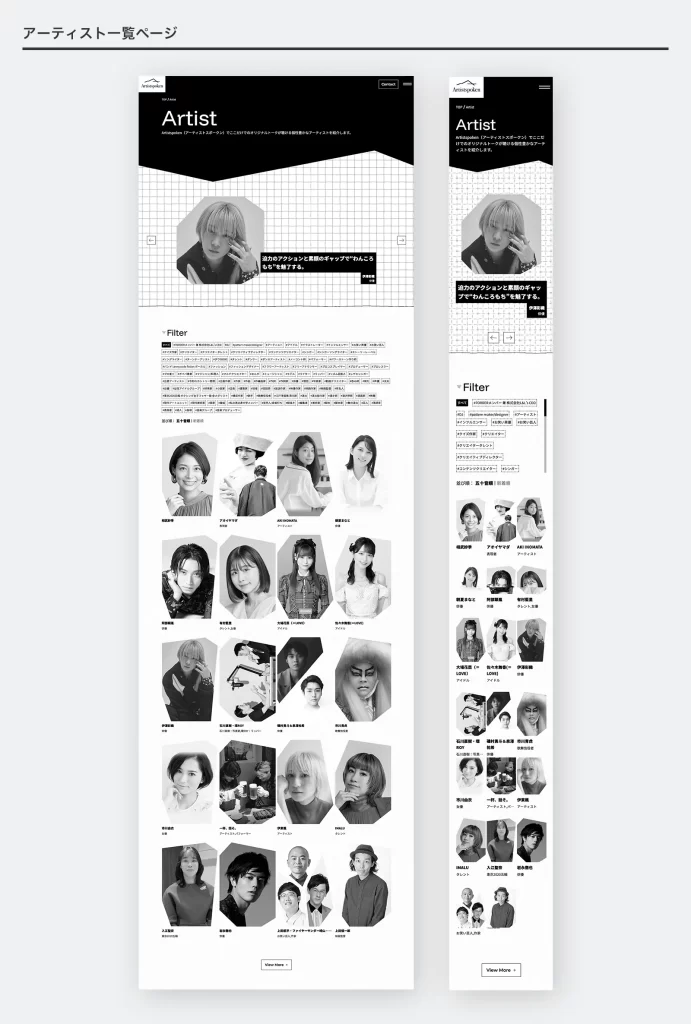 アーティスト一覧ではカテゴリラベルによる絞り込み機能を実装し、目的の情報にスムーズにたどり着けるよう、検索性にも配慮した設計としています。