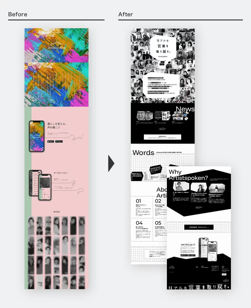 今回のリニューアルでは、アーティストの「言葉」を強調したいというクライアント様のご要望から、番組内でアーティストたちが発した「パンチライン」が落ちてきて積み重なる演出を取り入れ、視覚的にも印象に残る構成にしました。