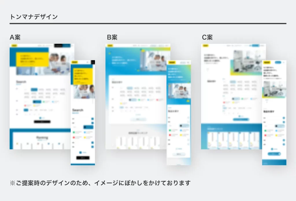 クライアント様側ですでにブランドデザインガイドラインが存在していたため、ガイドラインに準拠した案と、医療機器メーカーに適したクリーンなトーン&マナーを意識した案の複数パターンで、ラフを制作しました。