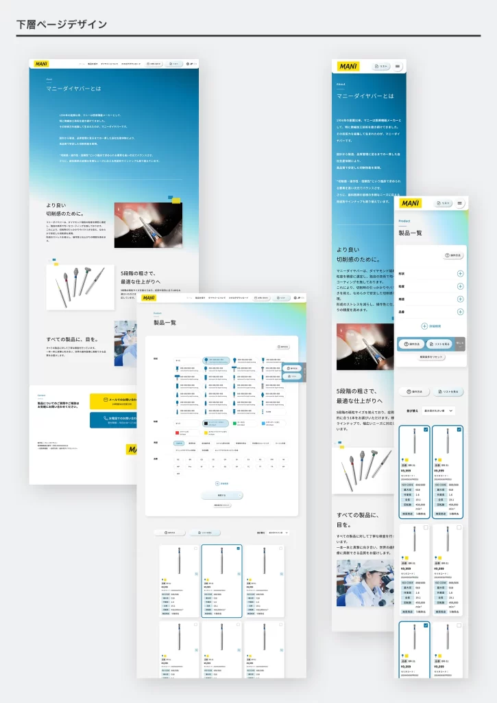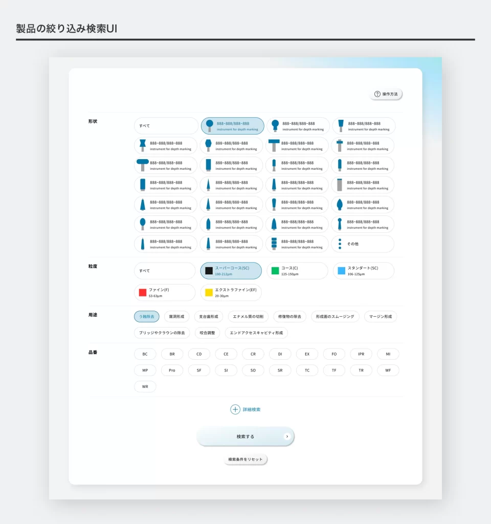 マニー株式会社様では、粒径・形状・サイズなどの違いにより製品ラインナップが多岐にわたり、歯科医師や販売代理店が用途に応じた製品をスムーズに探せる仕組みをご希望いただきました。